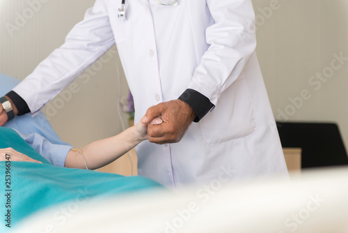 Woman patient giving handshake to man doctor at the hospital,Close up