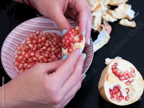 Woman peeling pomegranate seeds in bowl
