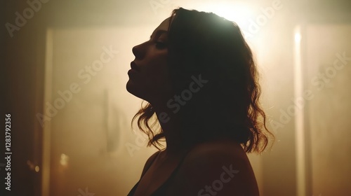 Woman, pensive, indoors, dim light, background blurry. Use Mental health, emotions