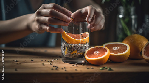 Woman pouring drink with chia seeds into glass, generative ai