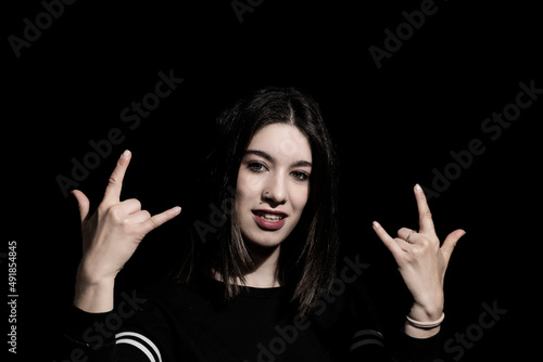woman putting horns with her hands with black background