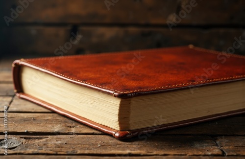 Woman reading a large leather-bound book placed on a rustic wooden surface