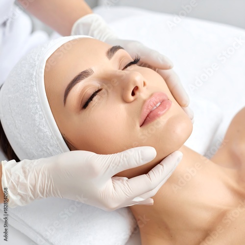 Woman receiving a facial treatment, eyes closed, hands on face, white backdrop