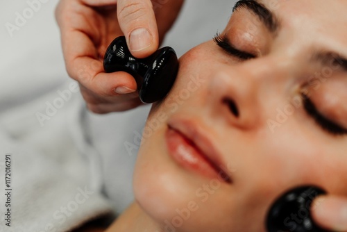 Woman receiving facial treatment with tools at a wellness spa during daytime