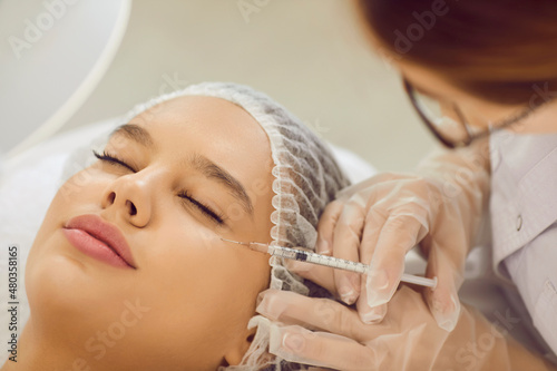 Woman receiving safe injection of youth. Beautiful lady getting corrective dermal aesthetic improvement. Skincare specialist doing restylane, silicone or PRP treatment for perfect rejuvenation