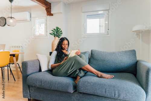 Woman relaxing on sofa reading a book in modern apartment