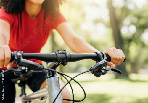 Woman riding a bicycle in a sunny park, enjoying outdoor fitness