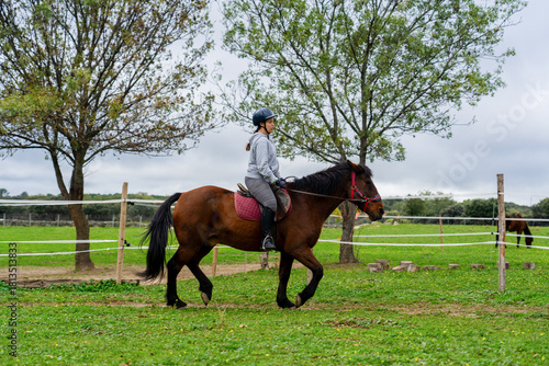 Woman riding horse in a green field