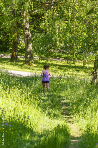 Woman running on a path in a meadow