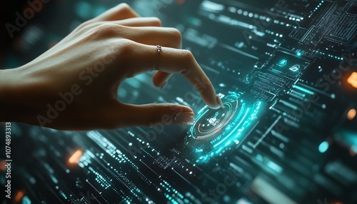 Woman s hand tapping an electronic certificate, with holographic scales and legal symbols, illustrating cuttingedge legal technology