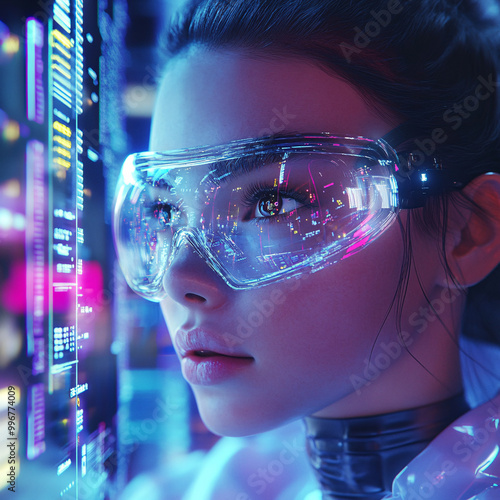 Woman scientist with glasses, surrounded by futuristic screens displaying data. Her focused expression reflects dedication, ideal for projects about technology and scientific advancements