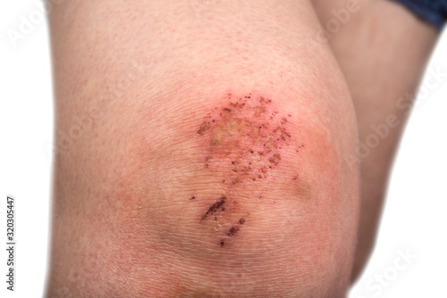 Woman scratch skin on the knee. Injury concept