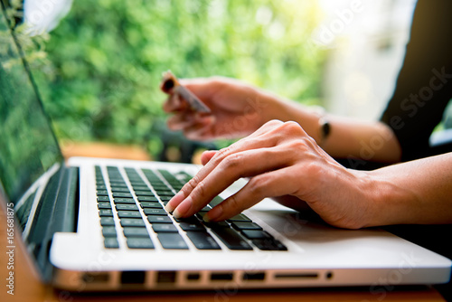 Woman shopping online Hands holding and using laptop