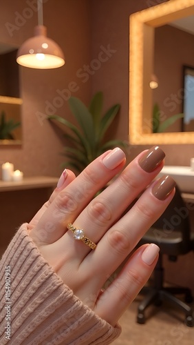 Woman showing off her beautiful mocha mousse manicure in a beauty salon. Hand close-up, background blurred.