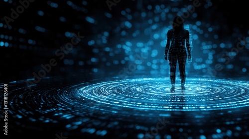 Woman Silhouette in Blue Light with Abstract Digital Circles and Data Patterns