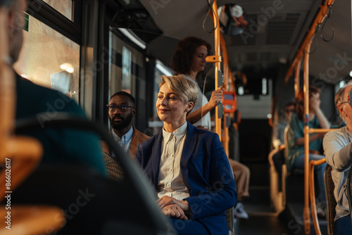 Woman sitting peacefully in a crowded public bus