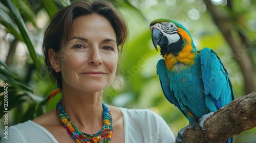 Woman smiles with parrot, tropical rainforest background. Use travel brochure