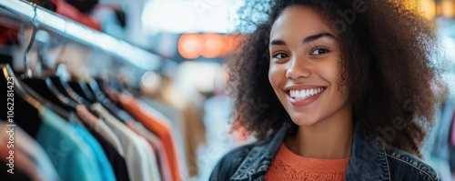 Woman smiling as she buys new clothes in a retail store, surrounded by sales signs