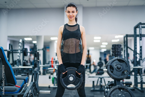 Woman Standing in Gym Holding Weight Machine. A woman confidently stands in a gym, holding a weight machine, ready for her workout.