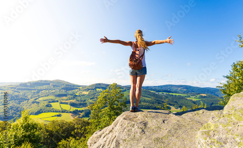 Woman standing on rocky cliff with arms raised enjoying panoramic view. Adventure, freedom, hiking or wellbeing concept