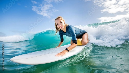 Woman Surfing a Wave on Surfboard