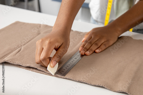 Woman tailor working with fabric marked out pattern of the garment making with tailors chalk