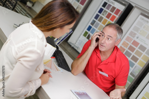 Woman talking to clerk in decorating store