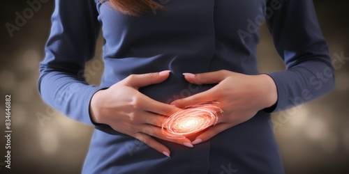 Woman touching stomach painful suffering from stomachache causes of menstruation period, ulcer, appendicitis or gastrointestinal system disease. health insurance concept