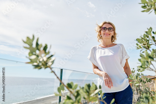 Woman traveler looking at camera enjoying the sun, admire seacoast view and breathing fresh sea air in hotel terrace.