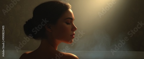 woman unwinding in a softly lit bathroom with rising steam for a refreshing start