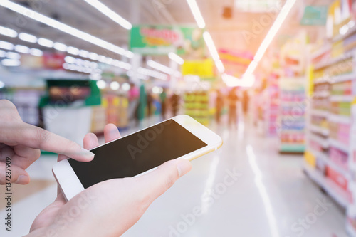 Woman using mobile smartphone while shopping in supermarket store