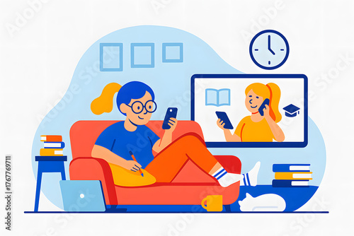 Woman using phone at home isolated on white background