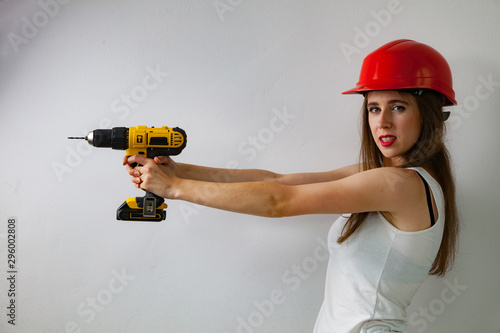 build, builder, carpenter, construction, cordless, bricolage, drill, fix, equipment, girl, home, improvement, indoor, interior, renovation, repair, tool, work, men at work, woman, job, maintenance