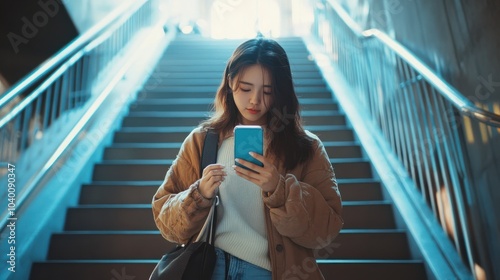 woman using smartphone on staircase in public areas, During leisure time. The concept of using the phone is essential in everyday life.