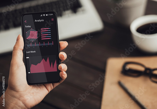 Woman using smartphone with online statistic and data analytics graphs on screen