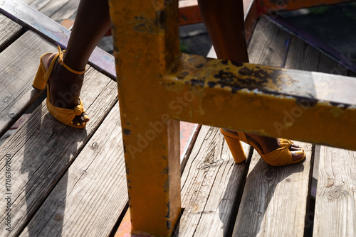 Woman walking in mustard yellow high heels