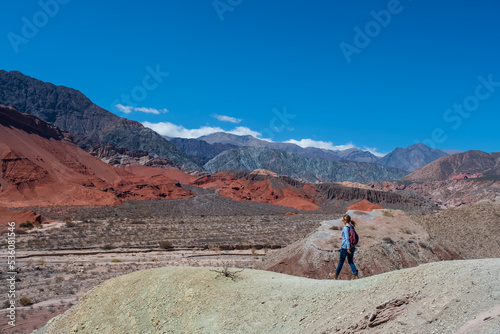 Woman walking in the colourfull mountain