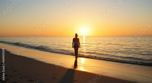 Woman Walking Towards Sunset on Sandy Beach