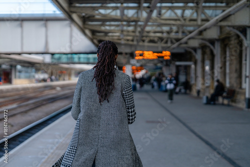 Woman walks at train station with platform signs visible