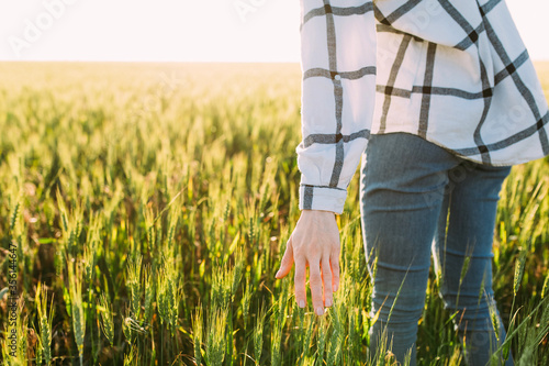 woman walks through a wheat field and touches the ears of wheat with her hands against the background of the sunset