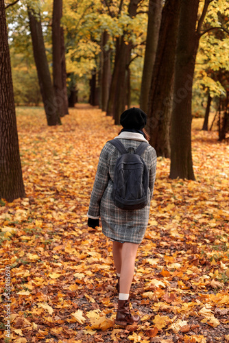 woman walks through an autumn forest or park and enjoys the beauty of nature. a time for privacy and silence. autumn mood, yellow leaves of trees. mental health, autumn exacerbation of depression