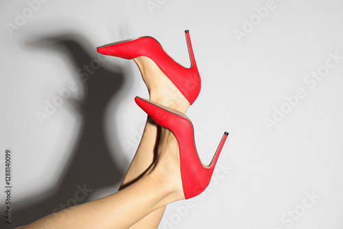 Woman wearing beautiful red high heeled shoes on white background, closeup