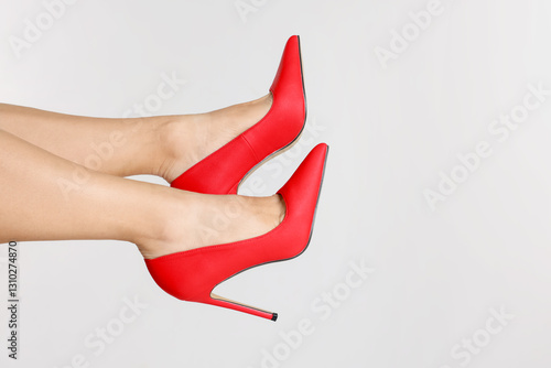 Woman wearing beautiful red high heeled shoes on white background, closeup