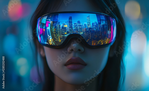 Woman Wearing Futuristic Goggles Reflecting Cityscape at Night