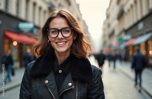 Woman wears black jacket. Stylish woman stands in city street. Cityscape background with shops, people. Casual urban style. Smiling person. Fashionable look. Trendy woman in city. Street style. City