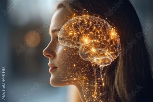 Woman with a glowing brain in profile showcasing brilliance and complex thought processes