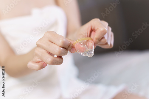 Woman with bath towel wrap herself on bed holding condom in hand, closeup. Safe sex concept.