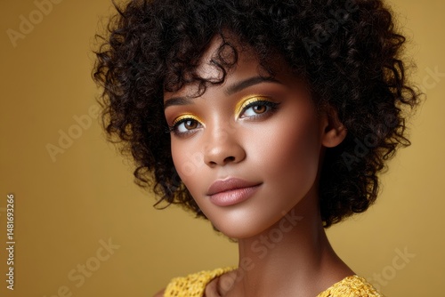 Woman with Curly Hair and Yellow Eyeshadow Posing
