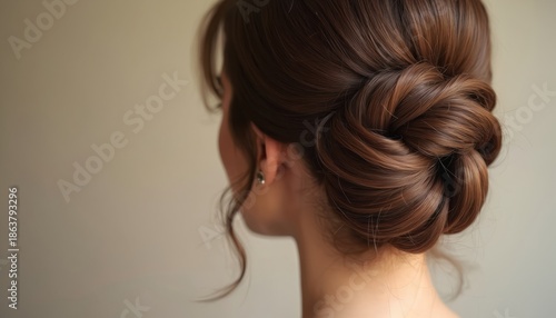 Woman with elegant brown chignon hairstyle. Smooth twisted hair bun styled at nape. Perfect bridal wedding updo or formal event coiffure. Studio portrait.