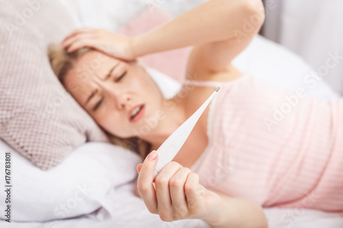 Woman with flu virus lying in bed, she is measuring her temperature with a thermometer and touching her forehead